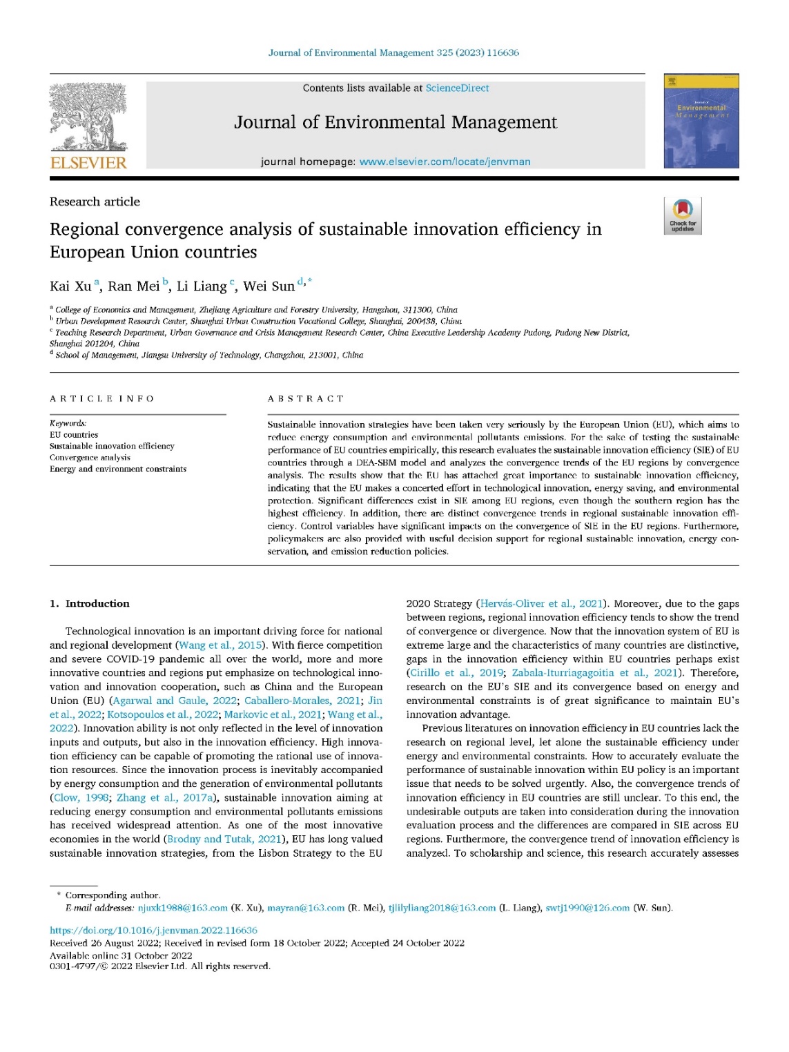 管工学科徐凯博士研究成果在权威期刊《Journal of Environmental Management》发表 近日,我院管理科学与工程学科青年教师徐凯博士撰写的论文 《Regional convergence analysis of sustainable innovation efficiency in European Union countries》在SCI权威期刊《Journal of Environmental Management》(ABS 3星, ABDC A,JCR Q1, 中科院2区top)发表。这是我院首次作为第一单位在该期刊发表论文。 该论文主要研究了能源、环境约束下的欧盟国家的可持续创新表现,并实证检验了各个地区创新效率的收敛趋...
