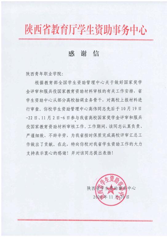 日前,陕西省教育厅学生资助事务中心向我院发来感谢信,感谢我院对全省学生资助工作的大力支持。