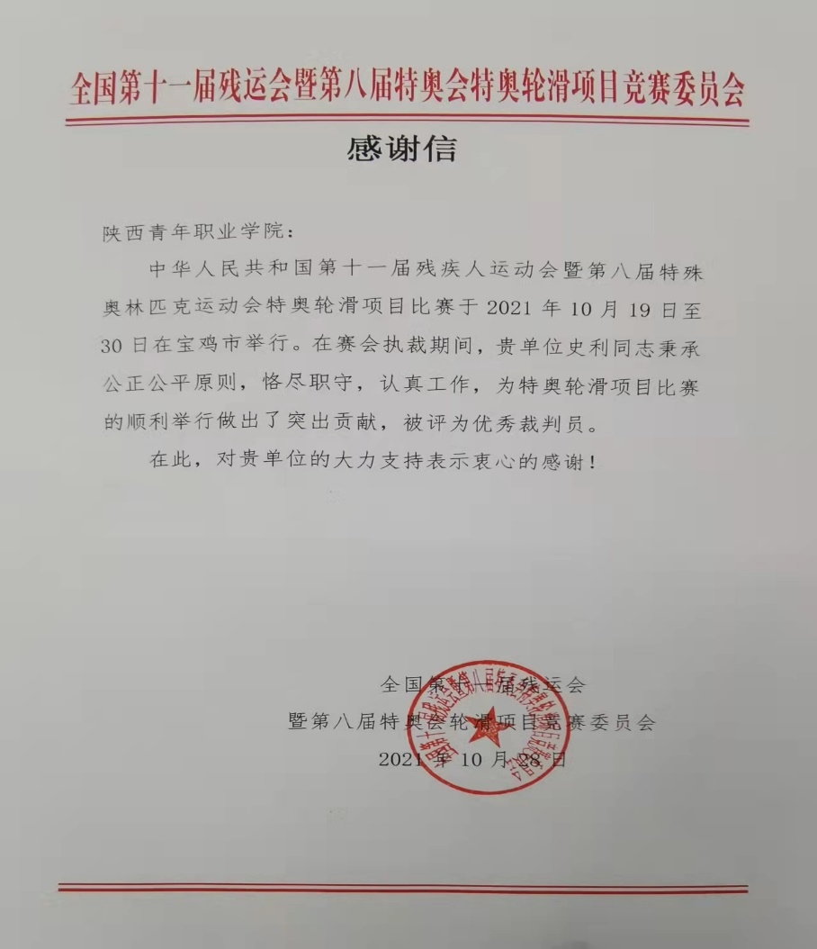 近日,全国第十一届残疾人运动会暨第八届特奥会轮滑竞赛委员会给我院发来感谢信,对我院公共课教研部体育教师史利参与轮滑比赛项目的执裁工作,为特奥轮滑项目比赛顺利举行做出贡献表示感谢。