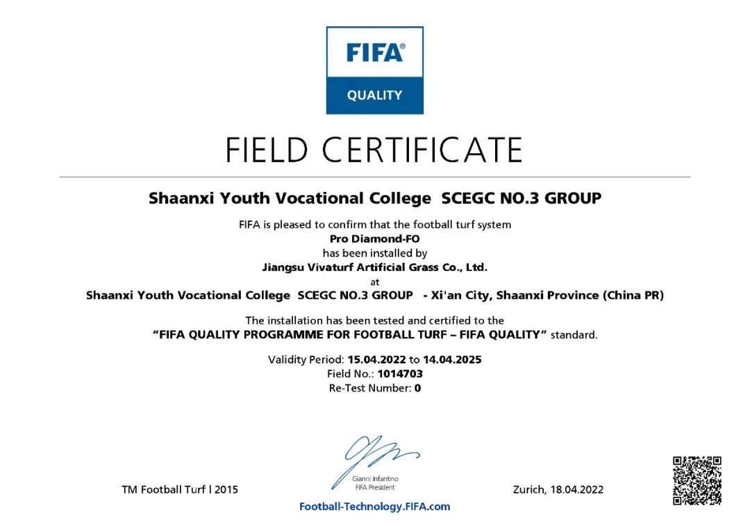 近日,经过国际足联FIFA指定的Labosport实验室的验收,由陕西建工第三建设集团有限公司承建、江苏威腾体育产业股份有限公司供应的我院长安校区专业足球运动场顺利通过国际足联FIFA足球场草坪质量检测,获得了FIFA QUALITY场地认证证书。