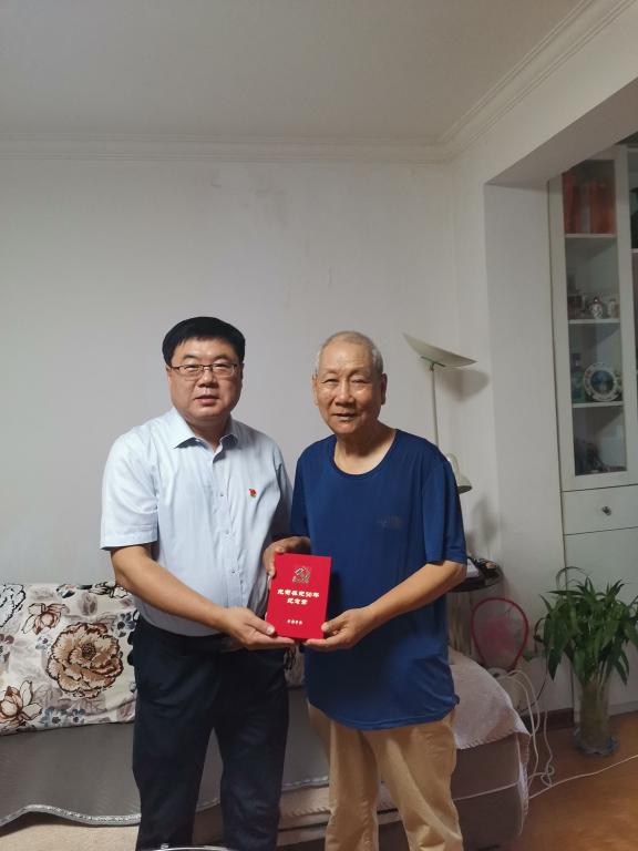 党委书记温锋科来到建党百年荣获“光荣在党50年”纪念章的老党员王克敏家中,与其唠家常、聊近况、问需求,代表校院党委表示亲切问候和关心。党委副书记、校(院)长刘瑞明为老党员张嘉林颁发中共中央“光荣在党50年”纪念章。其他党委委员分别走访赵仕芳、王玉洲、肖三洲、张宝印等老党员并为他们颁发纪念章。