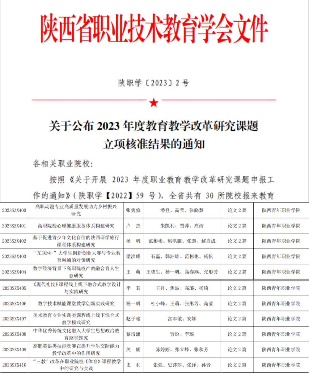 近日,陕西省职业技术教育学会发布《关于公布2023年度教育教学改革研究课题立项核准结果的通知》,校(院)“高职动漫专业高质量发展助力乡村振兴研究”等11项课题获批立项。