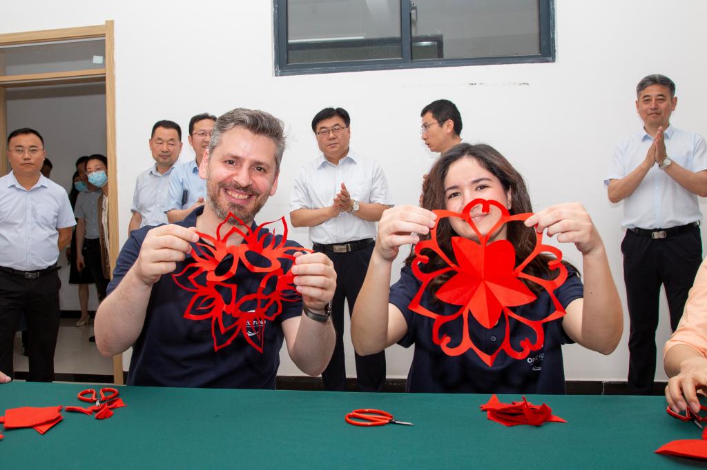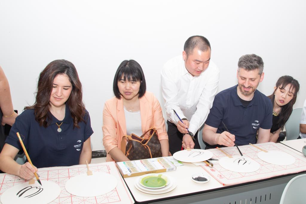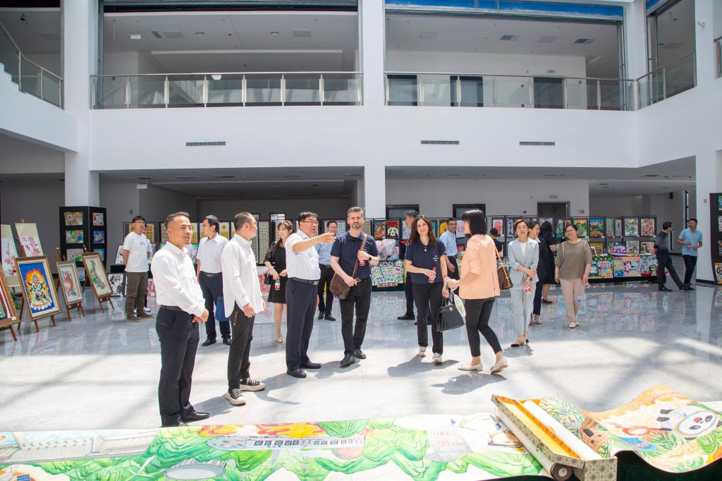 加法尔·马赫迪一行实地走访查看校(院)利用欧佩克基金进行校园基础设施建设的情况,了解项目推进进程与实施完成情况。在实训楼、教学楼,深入剪纸课、国画课课堂现场听课,观看学生进行古筝弹奏、合唱团演唱、中国民族民间舞表演及播音、配音实操,详细考察专业特色、课堂教学、实践训练、校企合作等方面情况;在图书馆查看内部建设与结构布局,浏览馆藏书库,参观书法绘画、手工工艺、创意设计等教学成果展,调研产学研融合推进文创成果转化的情况;在操场、学生生活区、餐厅了解建筑场地建设使用状况,与师生进行面对面交流,调研学生管理、校园活动、餐饮住宿、后勤保障等方面情况。