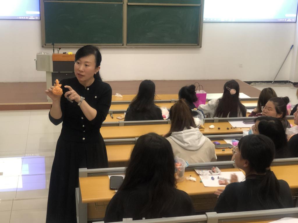 岳琦结合自己二十多年的从教经历,从“借形想象”的定义出发,介绍了幼儿园美术教育活动开展的前沿理念,结合丰富的幼儿美术作品,从借助色块、不规则形状、线条、撕纸剪纸、文字字母、图片、立体造型、组合创造等八个方面详细讲解示范了“借形想象”的基本原理和技法,并指导学生利用泡泡泥、马克笔、纸张等材料,现场进行创作实操。岳琦老师精心的准备、精彩的分享、耐心的指导赢得了在场同学们的阵阵掌声。