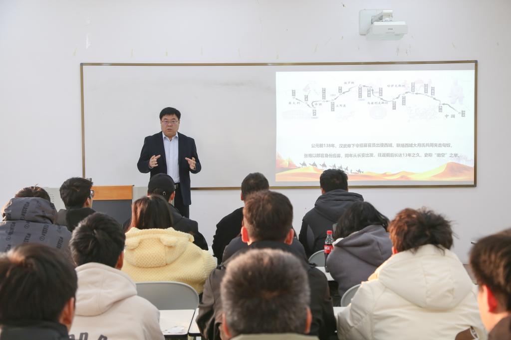 11月14日,院长刘瑞明在长安校区为2023级文化传媒系新闻采编与制作专业(网络与新媒体)班学生讲授专题思政课。马克思主义学院直属党支部书记、院长马雅玲,文化传媒系教学工作负责人杜小峰及部分思政教师和全体学生聆听了授课。