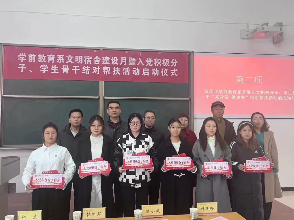 启动仪式上,卜建丽宣读了《学前教育系关于开展“文明宿舍”建设月活动的通知》,系团工委书记孙珠琳宣读了《学前教育系开展入党积极分子、学生骨干“亮身份 做表率”结对帮扶活动的通知》,祁志、刘延隆、潘小燕、刘延民、雷虎峰等老师为入党积极分子代表颁发“入党积极分子宿舍”标志牌。随后,入党积极分子、学生骨干代表董文瑞表态发言,她表示“结对帮扶”活动于人于己都具有重要意义,每一位学生入党积极分子和学生骨干都要提升个人政治认识,加强党性修养,把服务同学作为履行全心全意为人民服务的党员宗旨的具体行动,发挥模范带头和示范作用。新生代表郑泽萱表态发言,希望通过与优秀的学长学姐开展结对帮扶,能够让自己在思想、学习、生活等方面得到全方位的提升,成为一名优秀的当代大学生。