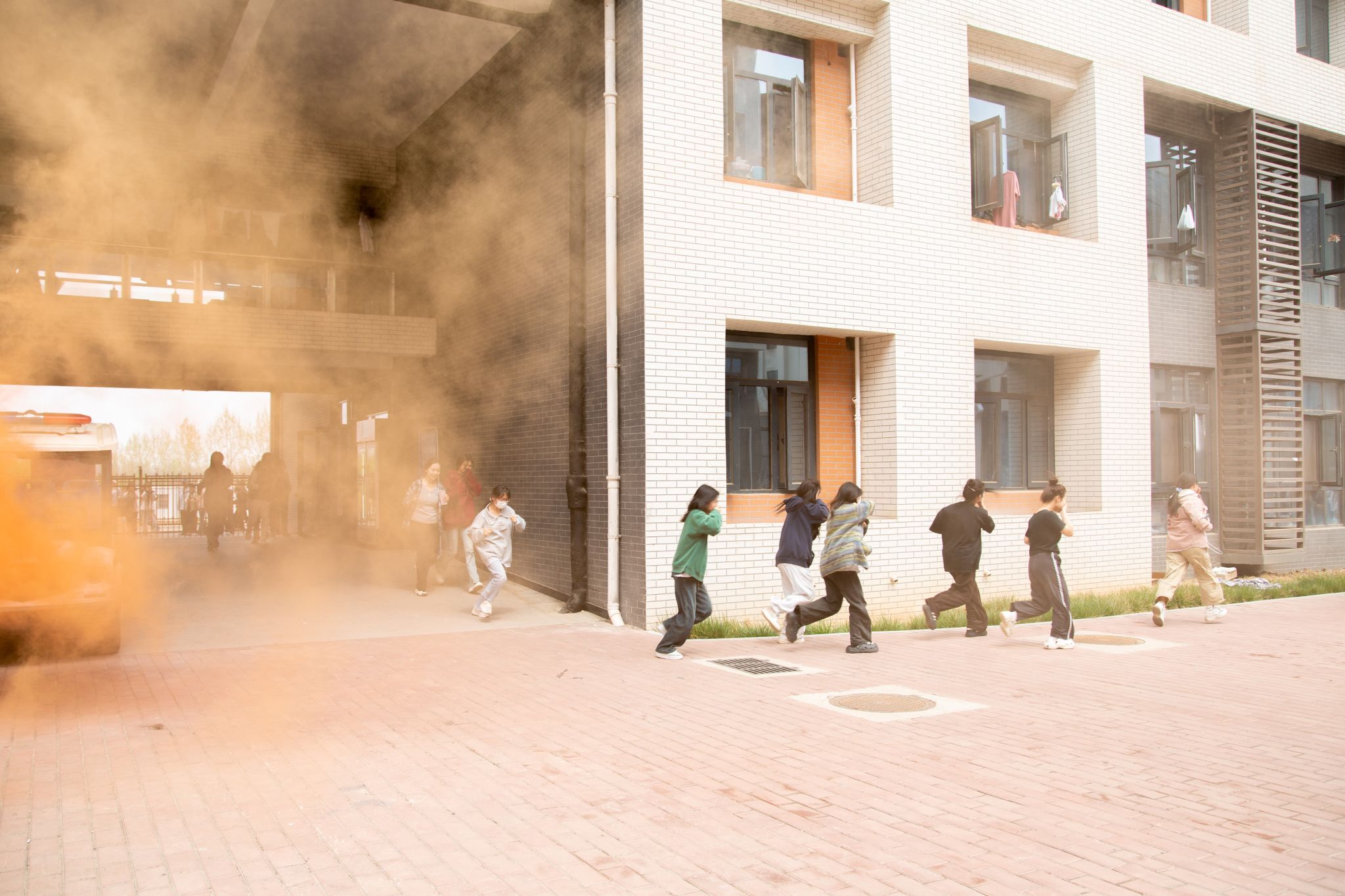 下午13:00点,各参演单位人员就位,韩凯军宣布:“william威廉中文官网2024年春季火灾疏散逃生演练现在开始”。安保人员点燃烟雾弹模拟火情,公寓区火灾警报响起,广播循环播放疏散提醒,公寓管理员收到火灾警报后迅速将17号公寓一楼所有安全疏散出口打开。17号公寓学生用湿毛巾捂住口鼻,低头弯腰,在各楼层辅导员层长的组织引导下按照预定的疏散路线有序疏散逃生至操场,按楼层迅速集合,清点人数,按照“舍长-层长-楼长”顺序汇总疏散人数,17号公寓楼楼长向学生处报告楼内应疏散人数和实际安全疏散人数。