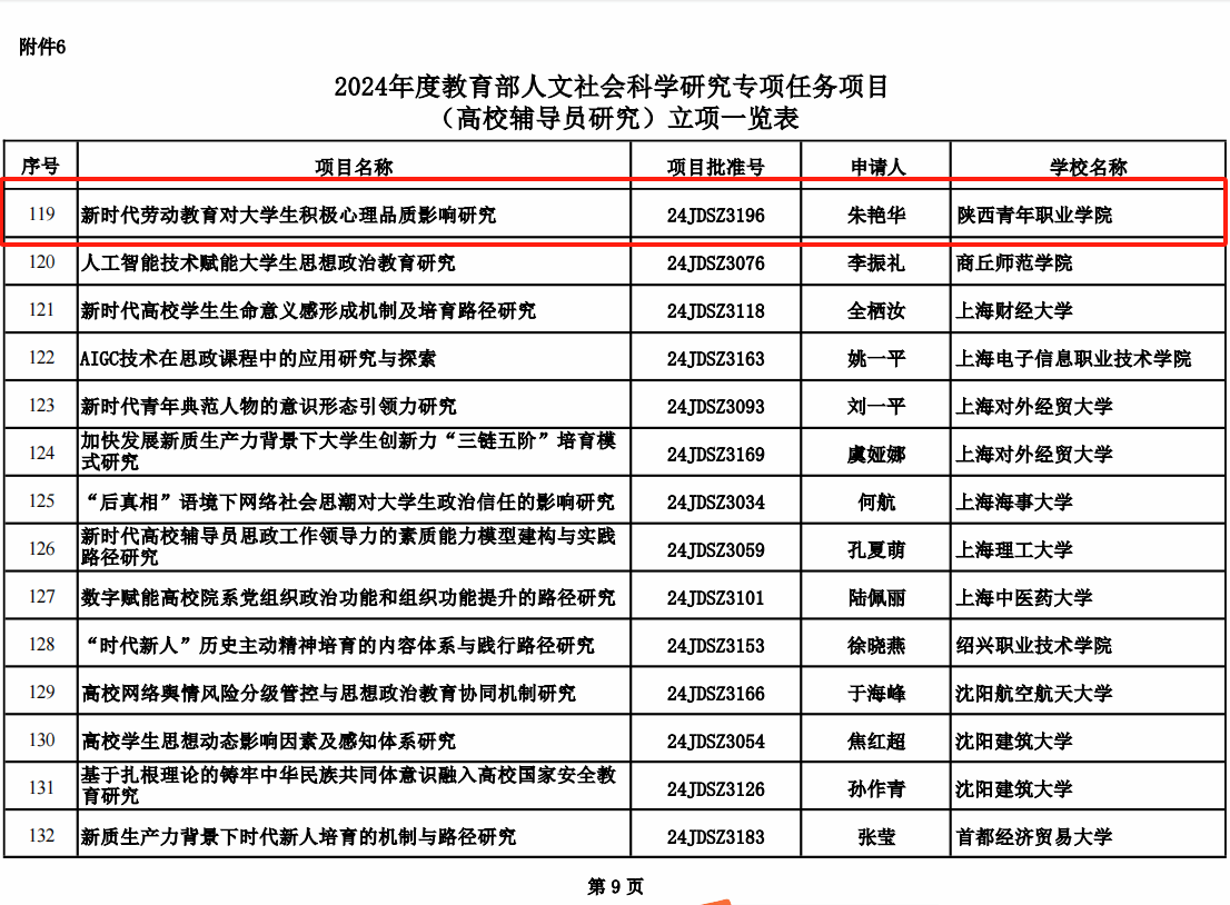 教育部人文社会科学研究项目是教育部面向全国普通高等学校设立的人文社会科学研究项目,其覆盖面广、影响大,具有重要的示范和引导作用。开展教育部人文社会科学研究项目,有利于深入贯彻《中共中央关于进一步繁荣发展哲学社会科学的意见》,推进学校人文社会科学事业的发展。其中,教育部人文社会科学研究专项任务项目(高校辅导员研究)旨在提升高校思想政治工作研究质量,专门面向高校辅导员而设置的研究项目。经专家严格评审和面向社会公示,2024年全国高校辅导员研究项目最终立项202项。