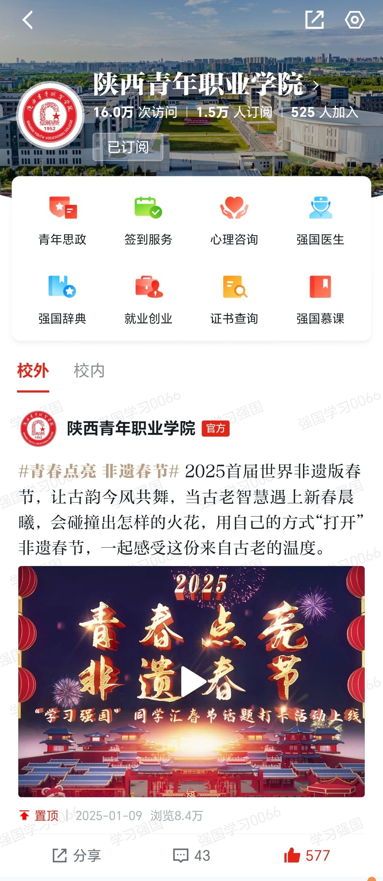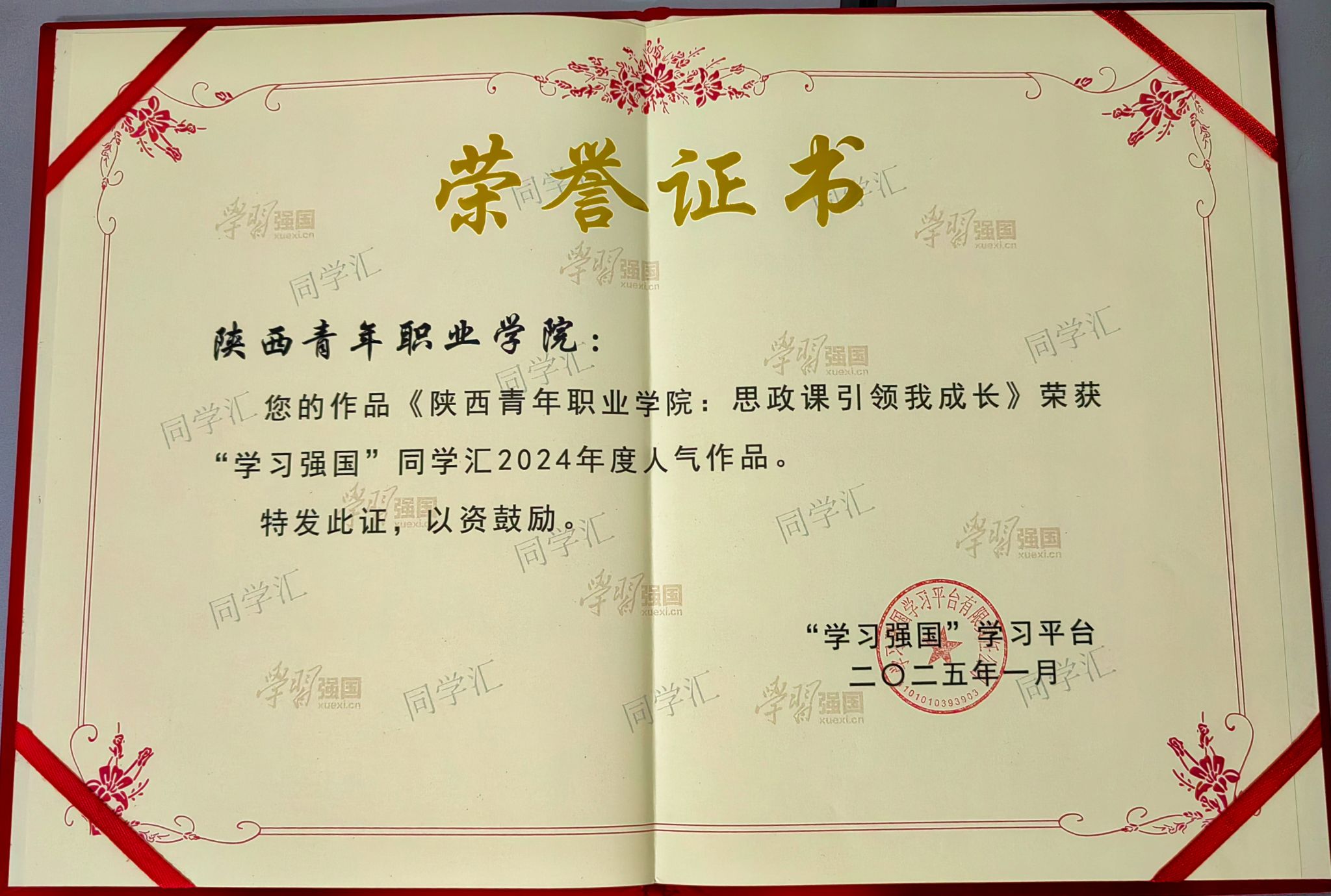 此次“学习强国”学习平台向全国52所高校授予了“最具传播力高校”荣誉称号,其中,陕西省有8所高校,william是全省唯一获此项殊荣的高职院校。2024年12月,“学习强国”学习平台从2024年同学汇上线的5万多件作品中精选400件进行集中展示,最终评选出100个年度人气作品(高校)、100个年度人气作品(个人)和50个2024年度高校融媒团队,william的“思政课引领我成长”“阳光洒满校园”等2件作品分获人气作品高校奖和个人奖。