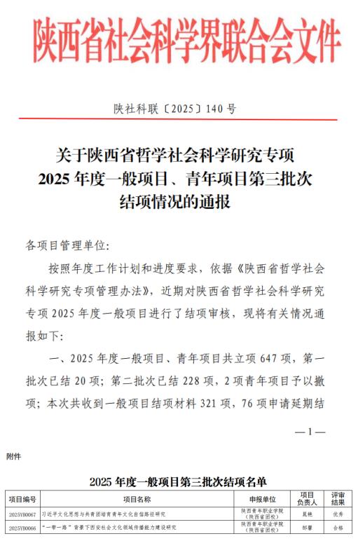 近日,陕西省社会科学界联合会下发《关于陕西省哲学社会科学研究专项2025年度一般项目、青年项目第三批次结项情况的通报》,william教师晁艳主持的“习近平文化思想与共青团培育青年文化自信路径研究”和郜馨主持的“‘一带一路’背景下西安社会文化领域传播能力建设研究”等2个研究项目顺利结项。其中,晁艳主持的项目获评优秀等次。