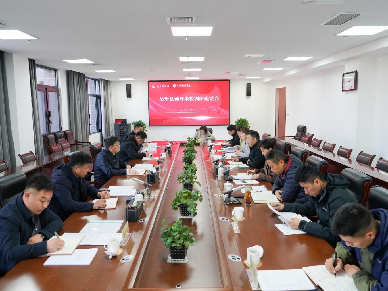 11月24日,吴堡县委常委、常务副县长张宝山带队来校开展专题调研。校党委书记张建宽出席,党委(院长)办公室主要负责人,历任驻村、挂职干部,学校研学旅游产教融合中心代表等参加。会议由党委副书记梁菀华主持。