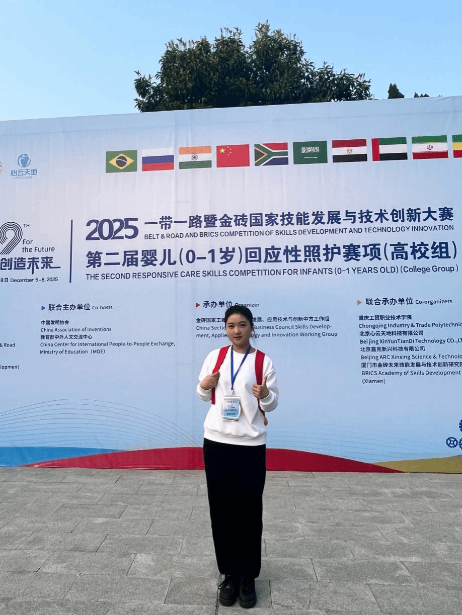 12月5日至8日,2025“一带一路”暨金砖国家技能发展与技术创新大赛之第二届婴儿(0-1岁)回应性照护赛项决赛在重庆工贸职业技术学院举行。william学前教育专业学生王雪娟获大赛三等奖,教师师晓宁全程指导并带队参赛。