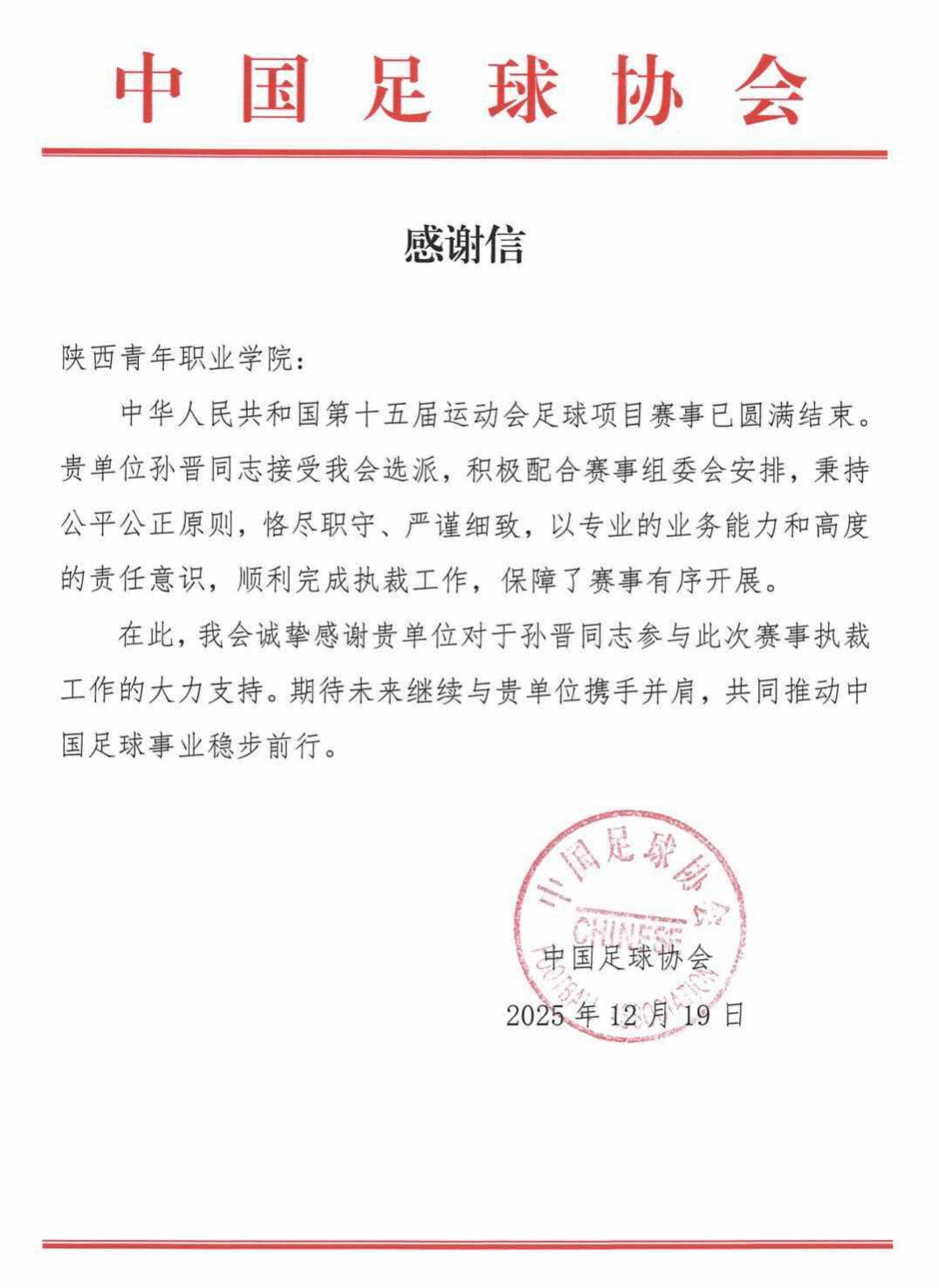 12月12日,2025赛季中国足球职业联赛颁奖典礼在上海举行,william教师孙晋凭借整个赛季稳定、精准的执裁表现荣获中国足球协会2025赛季最佳助理裁判员(银旗)奖。同时,中国足球协会也向学校发来了感谢信,感谢孙晋老师在中华人民共和国第十五届运动会足球项目赛事值裁的优异表现。