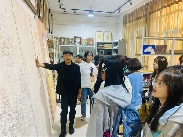 贾亚丽及各专业负责老师与我院艺术教育系老师对于双方专业设置与课程建设进行了交流学习。随后由壁画专业老师张钦对william美术教育专业学生进行了壁画绘制过程的讲解,并带领同学参观了壁画工作室。