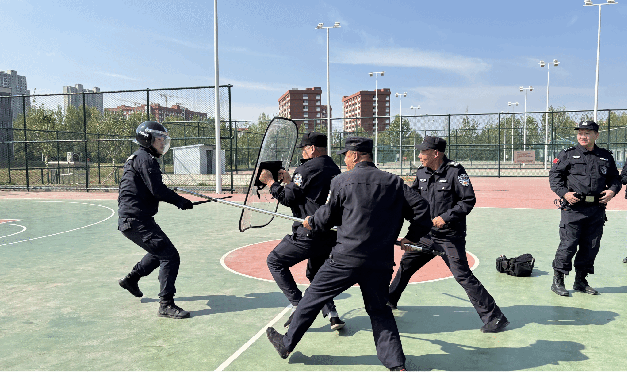 随后,进行分组实操演练,并由教官进行指导点评。一名民警穿戴防暴头盔扮演“暴徒”,手拿尖刀准备行凶,其他三名队员形成三角队形,分别手持盾牌、钢叉、长棍展开激烈搏斗,最终制服“暴徒”。演练中杜曲派出所民警快速响应,斗志昂扬,动作规范,做出了良好的示范。校卫队员踊跃参与,表现优异,获得一致好评。