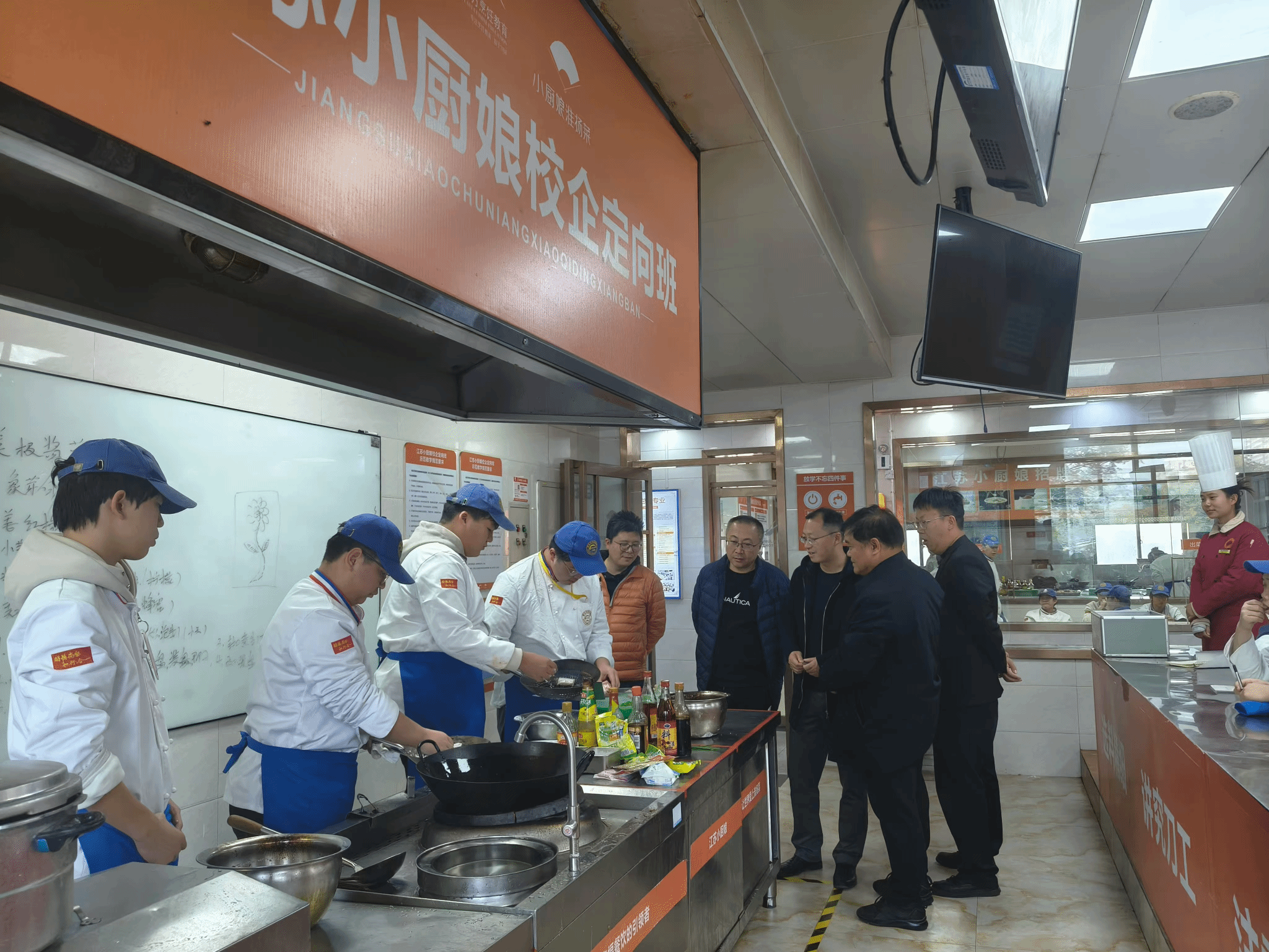 西安新东方烹饪技工学校副校长王安平、校区主任朱毅接待了学院一行,经简短会谈后陪同一起参观了学校实训楼教学示范厅、现代化操作大厅、中餐专业教室、西点专业教室、西餐专业教室、高铁乘务模拟室及“江苏小厨娘校企合作定向班”、“御品轩定向班”、“兰湘子定向班”等教学实训场地。