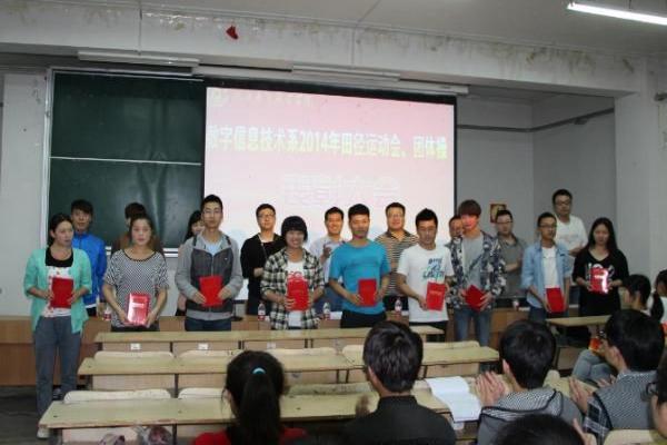 5月6日晚,数字信息技术系在青华校区举行2014年田径运动会表彰大会并组织学习了习近平总书记今年五四青年节在北京大学考察和师生座谈会上的讲话。系党总支书记、系主任李庆丰,主任助理杜海涛,有关教师及200余名学生代表参加了会议。会议由杜海涛主持。
