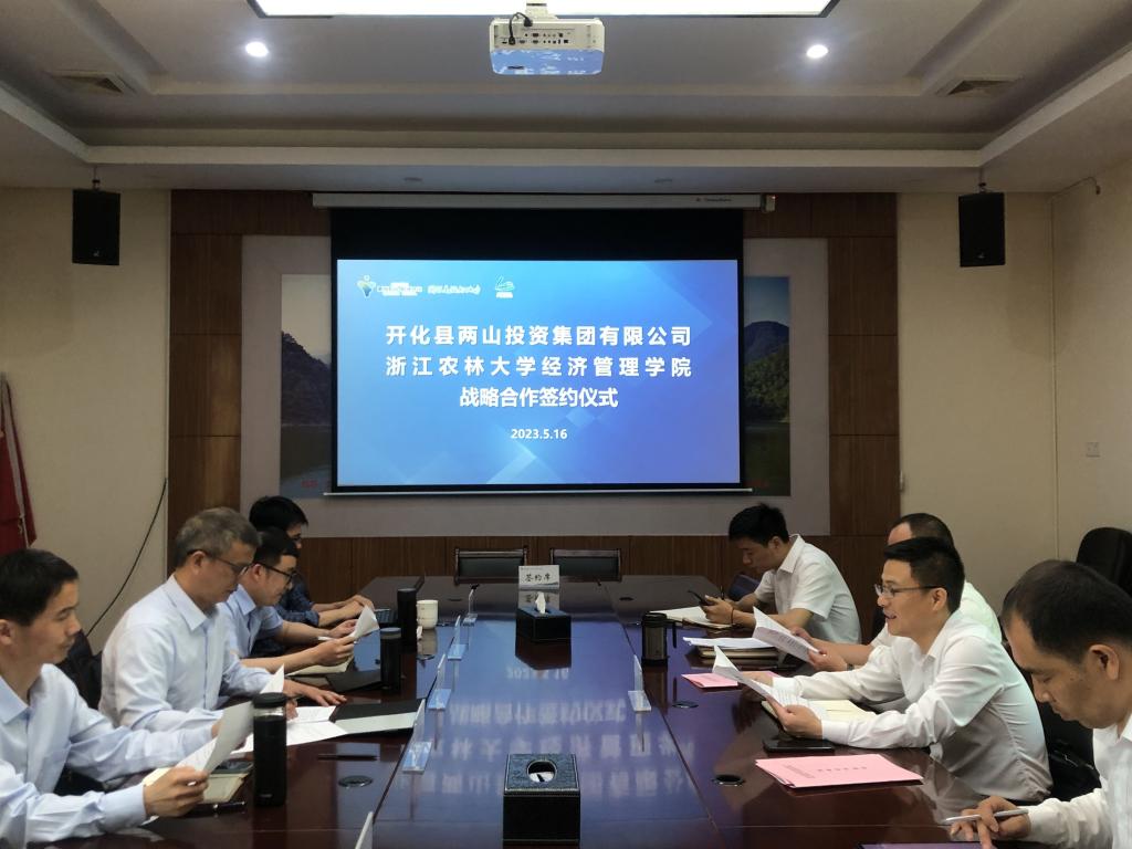 为落实全校服务全域战略,在双方前期充分沟通与酝酿的基础上,5月16日上午,学院与开化县两山集团举行了战略合作协议签订仪式,签订仪式在开化县两山集团举行。出席签订仪式的有吴伟光院长、朱臻副院长、企业管理学科专业负责人张国庆教授、学院社会合作办公室张群祥教授、夏芳副教授,两山集团董事长徐浩、副总经理汪燕明以及农业发展部、文旅运营部相关负责人。吴伟光院长与开化县两山集团徐浩董事长代表双方共同签订了合作协议。