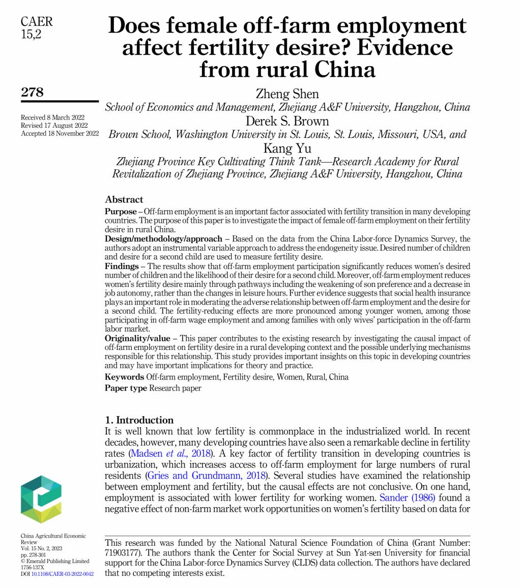 近日,由永利集团304官网沈政副教授和余康教授等人合作撰写的论文《Does female off-farm employment affect fertility desire? Evidence from rural China》在SSCI/SCI期刊《China Agricultural Economic Review》(经济学领域:JCR一区,农业经济与政策领域:JCR二区)发表。