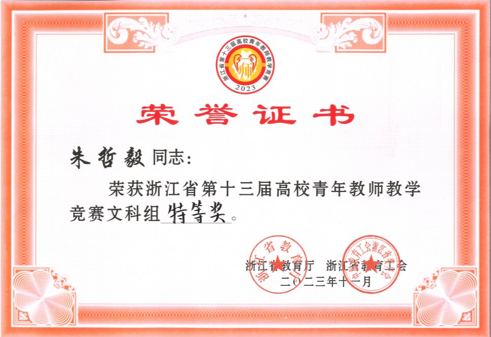 2023年11月4-5日,浙江省第十三届高校青年教师教学竞赛决赛在浙江中医药大学举行,我院青年教师朱哲毅斩获文科组特等奖。该成绩实现了我院在该竞赛领域的重大突破。