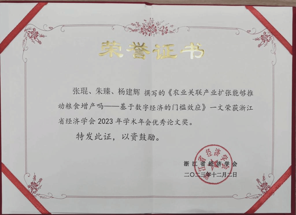 我院由顾光同教授带队,博士研究生朱书琦,硕士研究生金欣怡、姚玉秀和张琨分别就《数字金融如何赋能农村产业高质量发展:来自2011—2021年省域面板数据的实证》、《用能权交易制度是否提升全要素能源效率?——基于中国地级以上城市的考察》、《中国环境税改革对绿色全要素生产率的影响研究——基于“费”改“税”的实证考察》和《农业关联产业扩张能够推动粮食增产吗——基于数字经济的门槛效应》在平行论坛进行汇报。会议共评选出10篇优秀论文,由张琨、朱臻、杨建辉撰写的论文《农业关联产业扩张能够推动粮食增产吗——基于数字经济的门槛效应》获“优秀论文奖”。