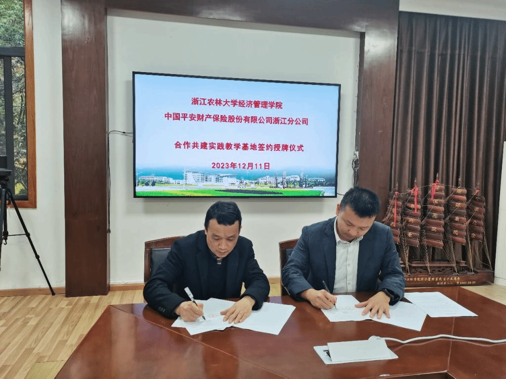 12月11日下午,永利集团304官网与中国平安财产保险股份有限公司浙江分公司举行合作共建实践教学基地签约授牌仪式在西大楼208会议室举行。永利集团304官网副院长蔡细平、副书记胡云云、农林经济管理专业负责人、学生办和教学办相关人员,中国平安财产保险股份有限公司浙江分公司副总经理周建毅、农村保险部经理孙瑞、人事行政部相关负责人员参加了仪式。仪式由永利集团304官网副院长蔡细平主持。