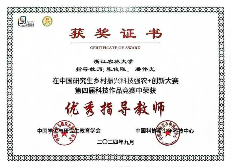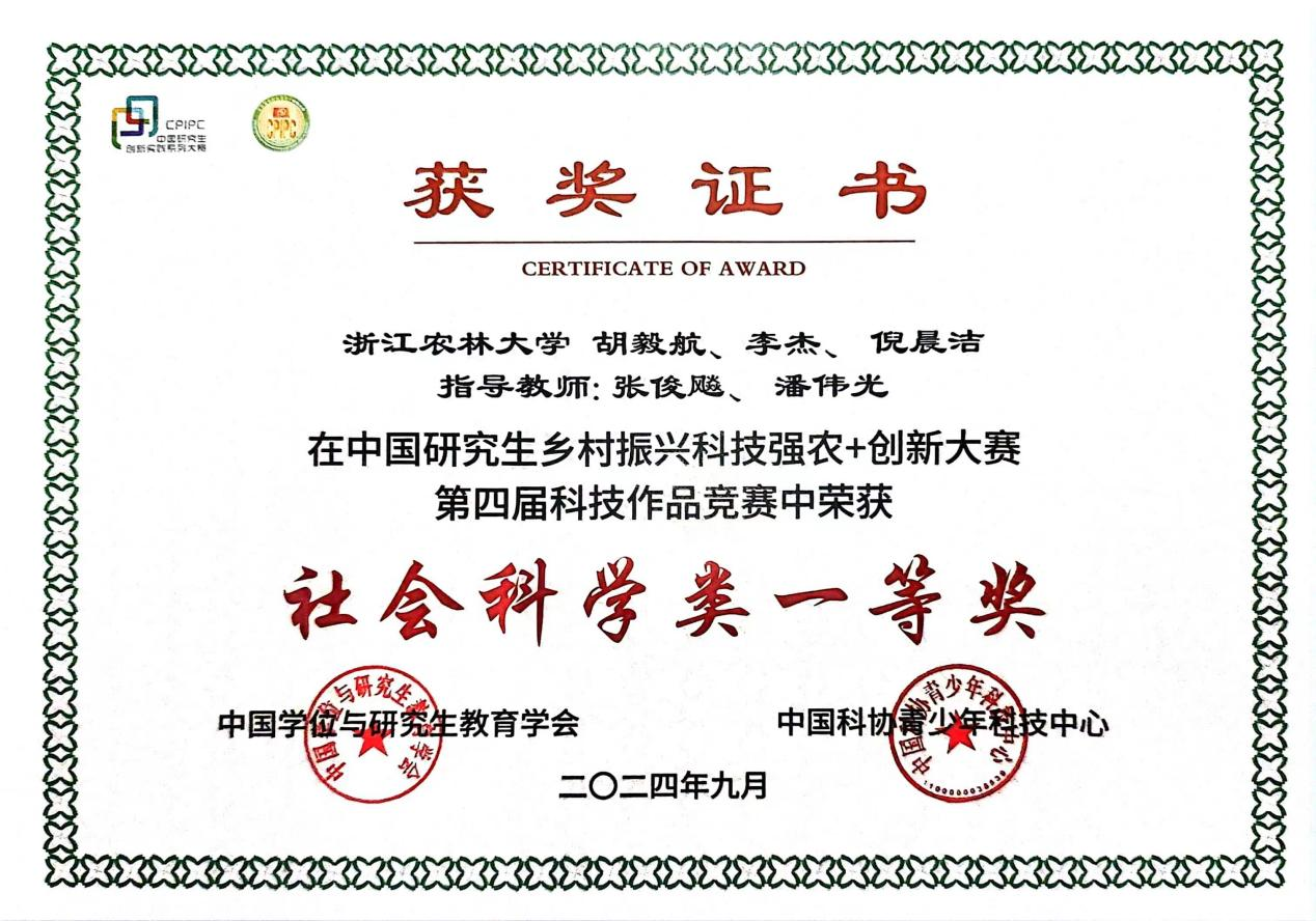 9月26日,永利官网胡毅航、李杰、倪晨洁3名硕博研究生作品《丹江口市生态文明建设与文化适应之鉴》,荣获中国研究生乡村振兴科技强农+创新大赛第四届科技作品竞赛一等奖。该项目由张俊飚教授、潘伟光教授共同指导,两位教师荣获优秀指导教师称号。