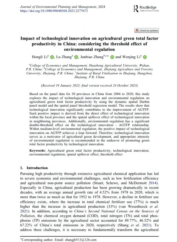 近日,张俊飚教授(通讯作者)与华中农业大学永利集团304官网博士生李红莉、张露教授以及李文静副教授在环境规划与管理领域著名期刊《Journal of Environmental Planning and Management》(SSCI,JCRQ2,中科院4区,IF=3.9)发表了题为“Impact of technological innovation on agricultural green total factor productivity in China: considering the threshold effect of environmental regulation”的研究论文。研究探究了技术创新对中国农业绿色全要素生产率提升的空间溢出效应,同时揭示了不同环境规制作用下技术创新对中国农业绿色全要素生产率的异质性门槛效应。