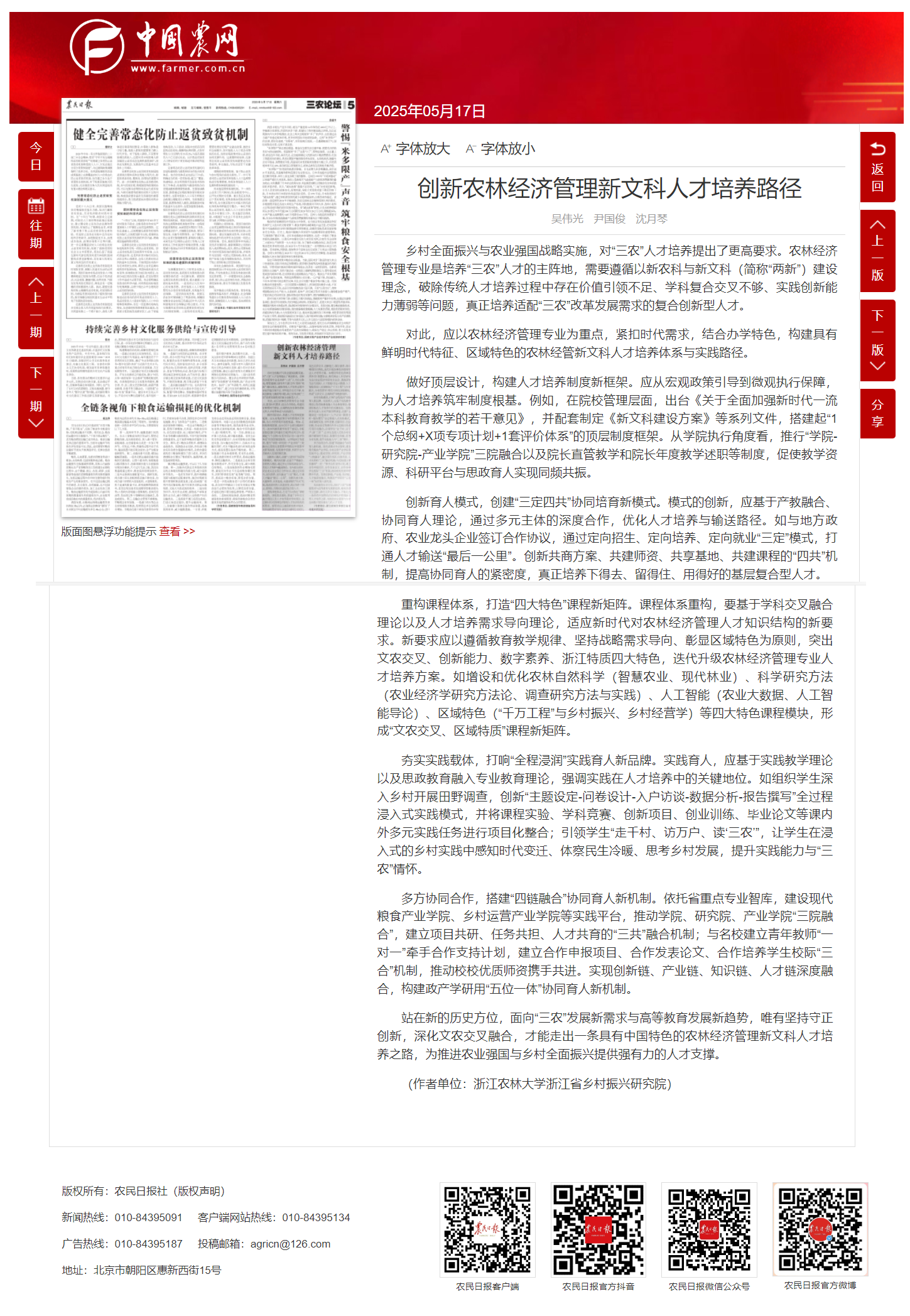 5月17日,由学院吴伟光教授、尹国俊教授、沈月琴教授共同撰写的理论文章“创新农林经济管理新文科人才培养路径 ” 在《农民日报》发表。这是我校新文科建设的最新成果,也是学院科教融汇的理论总结,为农林类高校新文科人才培养改革提供了可复制、可借鉴的经验。