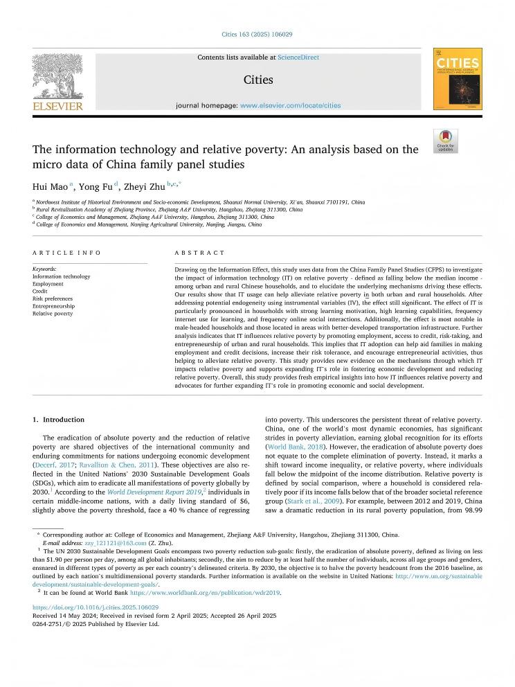 近日,由我院朱哲毅副教授作为通讯作者的学术论文“The information technology and relative poverty: An analysis based on the micro data of China family panel studies”在经济学1区top期刊《Cities》上发表。该论文是朱哲毅副教授主持的教育部人文社科青年项目(21YJC790173)的阶段性成果。