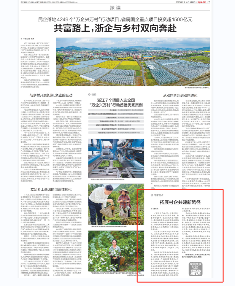 7月10日,我院潘伟光教授的“拓展村企共建新路径”的专家观点在《浙江日报》深读版发表,并在“潮新闻”《从“输血”到“造血”:浙江民营企业如何重塑乡村振兴新生态?》一文中刊发。