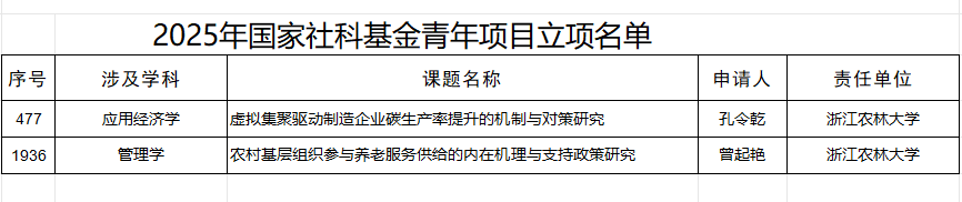 近日,国家自然科学基金委和全国哲学社会科学工作办公室分别公布了2025年项目评审结果,我院分别有5项国家自科基金项目和2项国家社科基金项目拟立项。其中国家自然科学基金拟立项数实现了学院历史突破。
