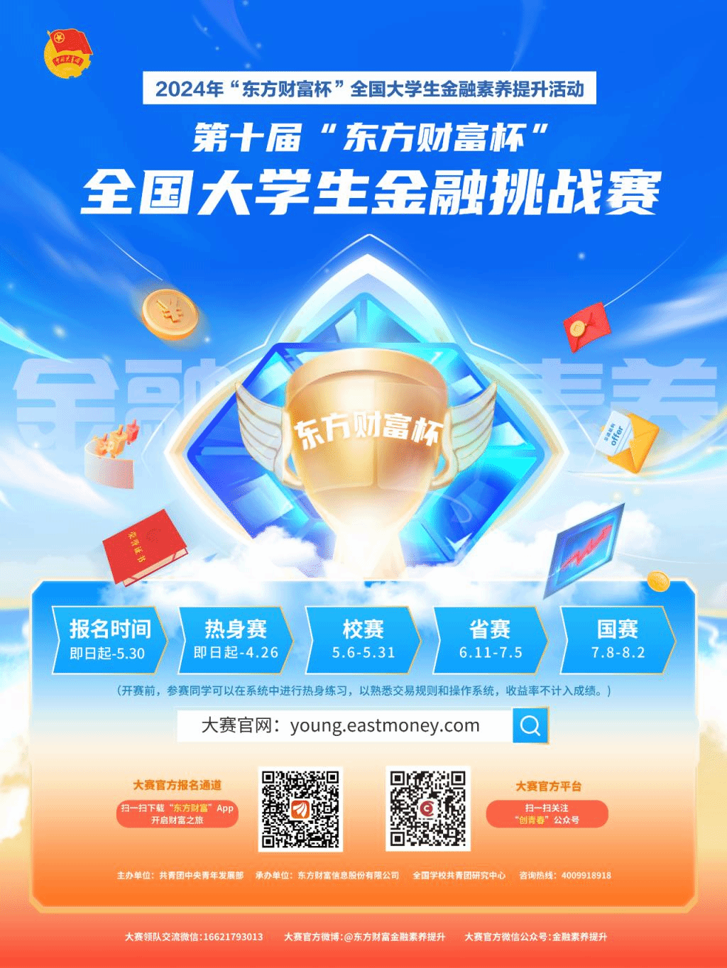 第十届“东方财富杯”全国大学生金融挑战赛由共青团中央青年发展部主办,全国学校共青团研究中心、东方财富信息股份有限公司承办,已列入永利集团304官网国家级二类学科竞赛,校赛由永利集团304官网永利集团304官网应用经济学学科主办、永利集团304官网校团委支持,所有在校本科生和研究生均可参赛。