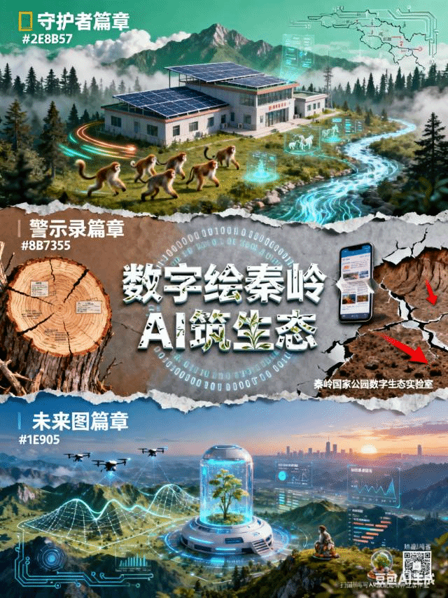 参赛选手围绕“秦岭生态之美”“数字赋能环保”等方向创作,充分发挥AI设计软件的智能排版、创意生成等优势,将秦岭山势、溪流、珍稀动植物等元素与保护理念融合。从提示词提炼到参数调试,作品凝聚着学子对秦岭生态的深刻理解与创意巧思。