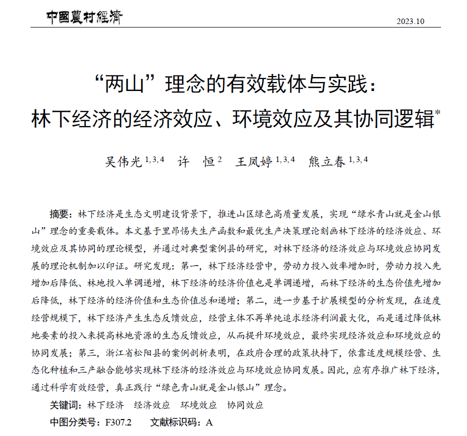 我院吴伟光教授团队研究成果在《中国农村经济》发表 近日,学院吴伟光教授团队的研究论文《“两山”理念的有效载体与实践:林下经济的经济效应、环境效应及其协同逻辑》在知名期刊《中国农村经济》2023年第10期发表。该文通过经济学模型推理和典型案例分析得出如下观点:证明了林下经济经营活动在创造经济价值的同时同样会创造生态价值,当林下经济所形成的生态价值有利于当地生态环境提升时,经营主体经营的林下经济及其周边生态环境的经济价值也会显现,即产生正向的生态反馈效...